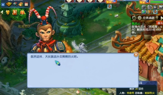 5、我们一共击杀5团火焰,可以先杀2团,然后找到这个鬼鬼祟祟的黑熊精,点杀他,这个时候一般奖励是最好的,我每次都有一个C66 彩果 宝石 符石,记住一定要一个回合结束战斗。